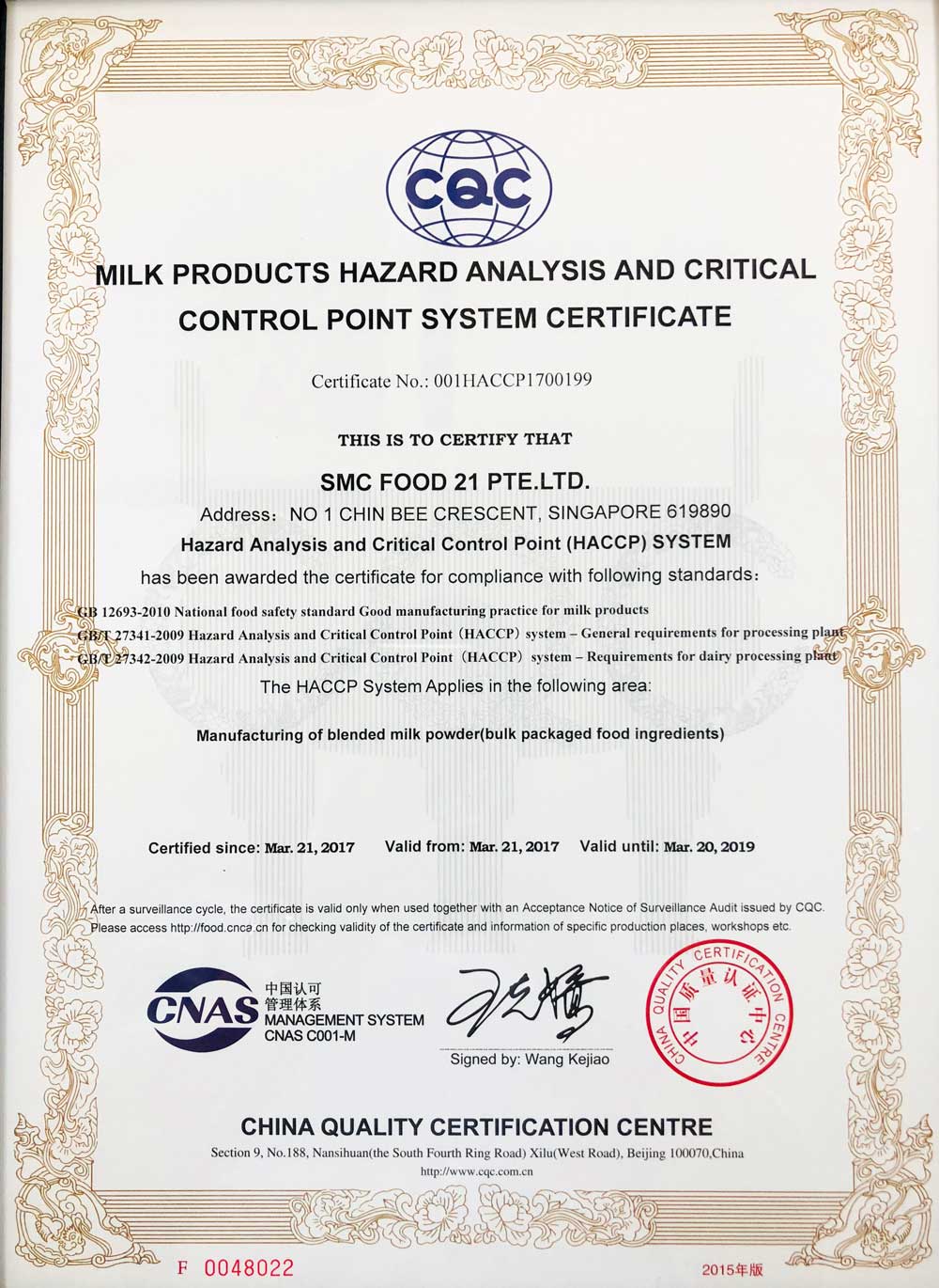 Certified by China Quality Certification Centre (CQC) for compliance with the National food safety standard Good manufacturing practice for milk products and adhering to Hazard Analysis and Critical Control Point (HACCP) system for processing and dairy processing plants.